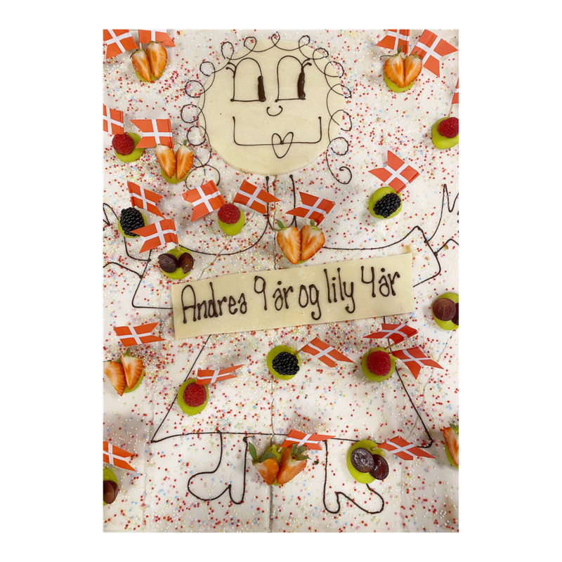 Med linsedejsbund, hindbærsyltetøj, glasur, krymmel og frugt på toppen. Kan laves til 10 eller 20 pers.
