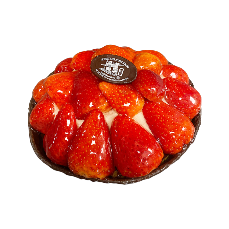 Jordbærtærte med mazarinbund og vaniljecreme.